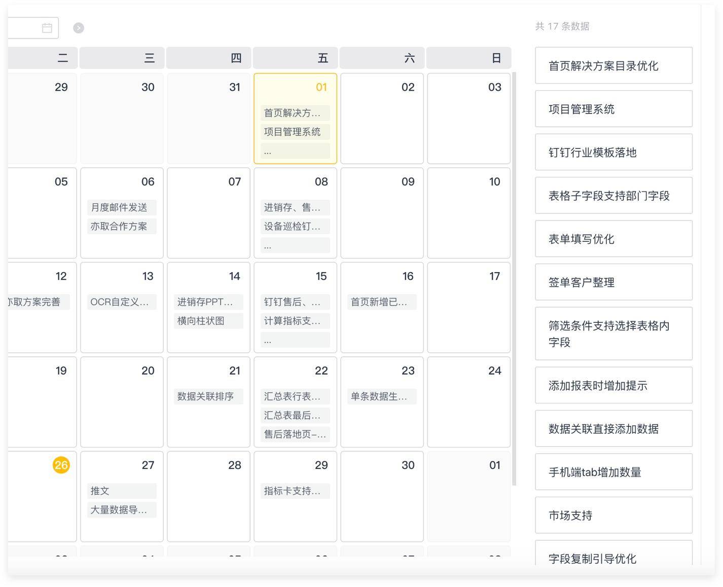 轻流的日历视图是一种以时间维度进行管理数据的方式,成员可以通过日历查看每天的日程安排。日历图在项目进度管理中,能让管理者了解每日工作任务保证项目进度,避免出现任务遗忘等问题。 ![]()