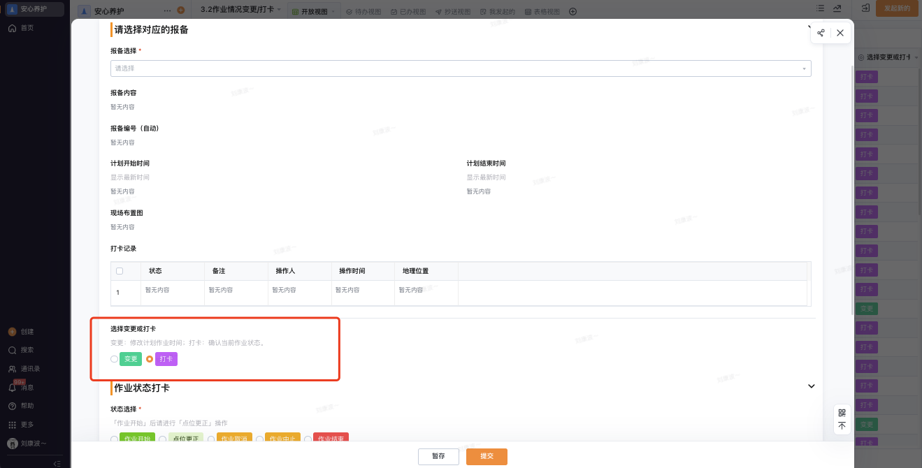 “作业情况变更/打卡”用于现场负责人对现场情况进行打卡登记。负责人在选择报备后,报备编号、现场布置图、打卡记录等信息自动填充,无需填写重复信息,快速记录作业状态。如果需要修改计划作业时间也可直接在表内选择填写,快速且方便。