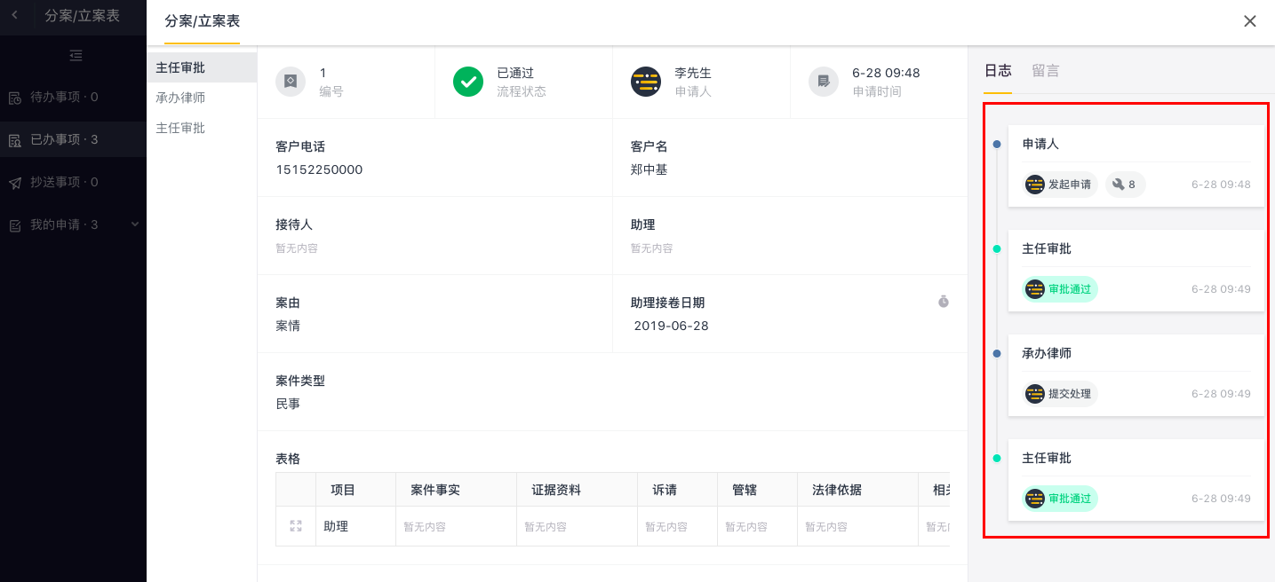 表单提交后,会自动流转到主任那里进行审批,审批通过后直接到承办律师那里,承办律师补充完相关的信息之后,主任会再次进行审核。接着,系统会根据案件类型自动化把案件信息归档到所属的案件信息应用中。