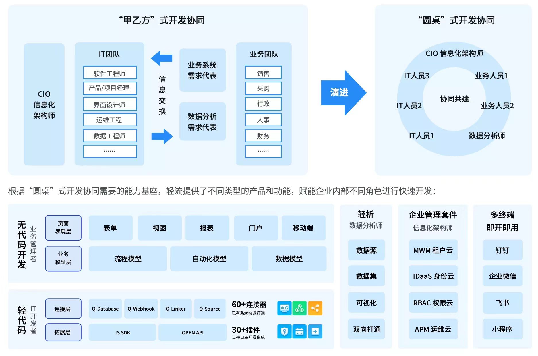 本次报告入选是对在无代码促进跨部门协作、赋能企业数字化领域实践成果的充分肯定。未来,轻流也将根据“圆桌”式开发协同需要的能力基座,持续丰富无代码产品矩阵,提升扩展客户服务能力体系,加速企业数字化转型升级。